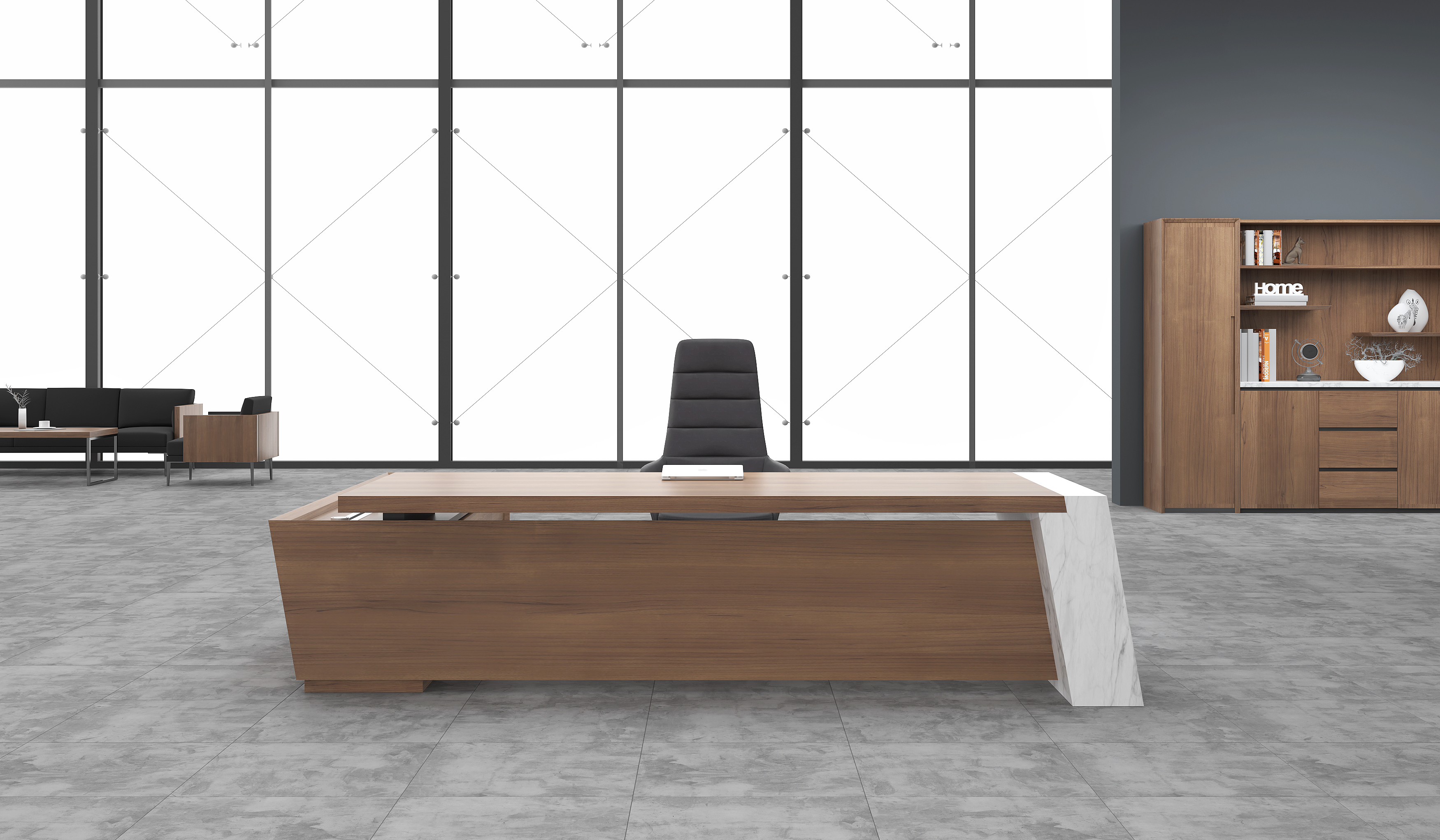 MAGIC senior executive desk use the process of "wood and stone" in the design. The whole platform is tilted, but marble is used on one side of the tilt point. Visually produce aesthetic feeling, and apply balance mechanics to the extreme in appearance design.
